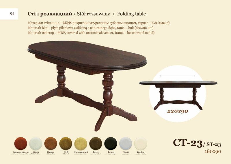 В связи с нестабильностью курса, а так же частыми повышениями цен на фабрике, просьба уточнять цены. С Уважением Интернет-магазин - mebel1.od.ua Наименование: Размер (ШхВхГ): Цвет: Стол раскладной "СТ-23" 1800(2200)х900 1. Красное дерево 2. Белый + 20% к цене 3. Ольха 4. Дуб 5. Натуральный 6. Орех 7. Венге тёмный + 10% к цене 8. Серый + 10% к цене 9. Ваниль + 20 % к цене