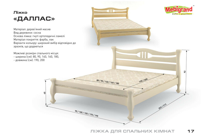 Внимание, во избежание недоразумений, перед заказом товара, просьба уточнять цену и наличие! Кровать Даллас: Материал: Деревянный массив Вид дерева: Сосна Основание кровати: Гнутые ортопедические ламели Материал покрытия: Краска, лак Возможные размеры спального места: Ширина (см): 90, 140, 160, 180 Длина (см): 200 ВНИМАНИЕ: Матрас в стоимость не входит Цена указана за размер 160х200 в самой дешевой категории цвета (1 из 5) Все остальные вопросы уточняйте у менеджера