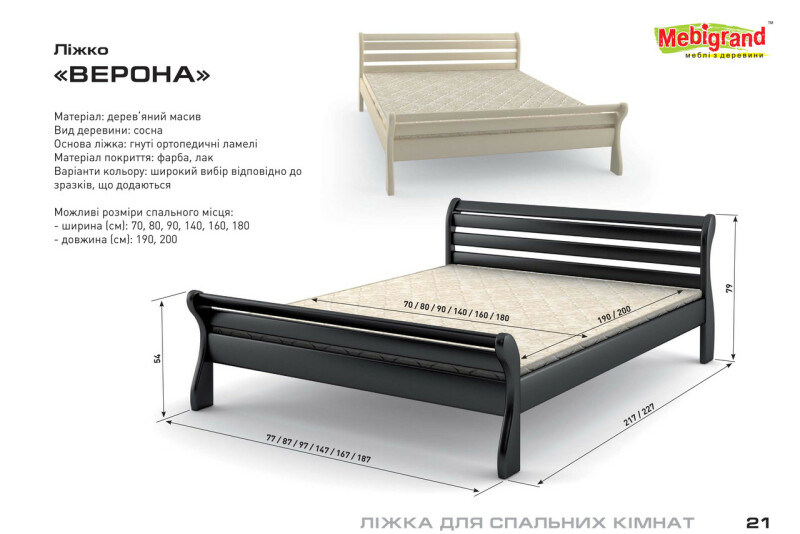 Внимание, во избежание недоразумений, перед заказом товара, просьба уточнять цену и наличие! Кровать Верона: Материал: Деревянный массив Вид дерева: Сосна Основание кровати: Гнутые ортопедические ламели Материал покрытия: Краска, лак Возможные размеры спального места: Ширина (см): 90, 140, 160, 180 Длина (см): 200 ВНИМАНИЕ: Матрас в стоимость не входит Цена указана за размер 160х200 в самой дешевой категории цвета (1 из 5) Все остальные вопросы уточняйте у менеджера