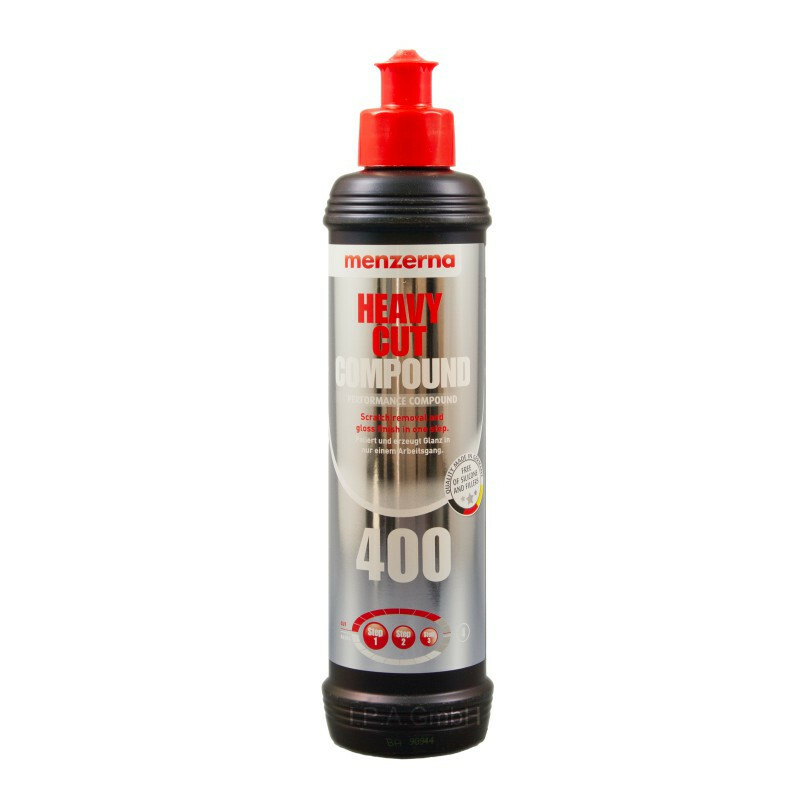 высокая производительность шлифования для устойчивых к царапинам красок Обработка вручную или машиной без наполнителей и силиконов Информация о продукте "Menzerna Heavy Cut Compound 400 One Step" Heavy Cut Compound 400 - это инновационный шлифовальный лак для автомобильных лаков. Этот полироль устраняет следы шлифования от 1200 зернистости, а также следы износа в кратчайшие сроки и гарантирует идеальную поверхность. Шлифовальная краска фирмы Menzerna имеет специальную формулу для устойчивых к царапинам красок. Это работает до финишной области, разделяя полировку зерна. Menzerna Compound 400 основан на глиноземе, что делает его идеальным для обработки тусклых и тусклых красок, а также для новых лакокрасочных покрытий. Идеально подходит для удаления брызг, быстрого шлифования и удаления следов использования. Высокая степень глянца достигается после первого прохода. Без наполнителей и силиконов. Применение: Как всегда, слегка смочить полировочную губку (влажная). Затем нанесите несколько маленьких мазков продукта на полировочную губку. Подайте легкое давление и снова уменьшите давление, когда продукт начнет высыхать. Просто удалите остатки полировки тканью из микроволокна. преимущества: Огромная экономия времени благодаря одноступенчатой полировке Производит высокий глянец Низкое развитие пыли Легко стирается Простая обработка Свойства абразивной пасты для тяжелых соединений 400: силикона Делимое абразивное зерно обеспечивает высокую производительность вплоть до финишной зоны Удаление грунта P2000