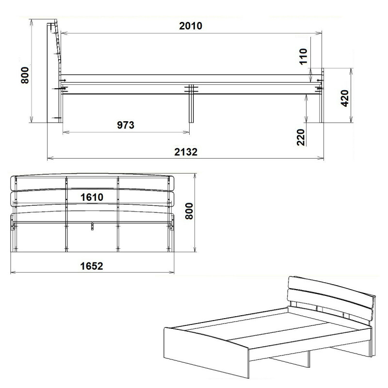 Габаритные размеры: Ширина: 1652 мм. Высота: 800 мм. Глубина: 2132 мм. Проём под матрас -2010х1610х60 мм. Размер упаковки: часть-1 Кровать Модерн-160 2010х802х48 мм. Размер упаковки: часть-2 Кровать Модерн-160 1652х420х98 мм. Материал: ламинированное ДСП. Цвет ДСП: Бук, Венге, Ольха, Орех Экко, Яблоня, Дуб Сонома, Нимфея Альба, Дуб комби.