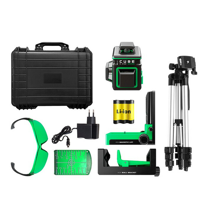 ОПИСАНИЕ: Лазерный уровень ADA CUBE 3-360 GREEN – самый компактный построитель трех лазерных плоскостей 360°. Благодаря специальному излучателю горизонтальный и вертикальные лучи проецируется на 360°. Три взаимно перпендикулярные плоскости позволяют выполнить абсолютно любую разметку. Идеально подходит при проведении строительных или ремонтных работ снаружи и внутри помещений. Яркий зеленый луч. Главное отличие ADA CUBE 3-360 GREEN заключается в использовании зеленого лазерного излучателя. Зеленый луч отлично подходит для разметки при ярком свете. Зеленую лазерную линию очень хорошо видно по сравнению с красной при равных условиях освещенности. Удобная разметка. Уровень проецирует три плоскости: одну горизонтальную и две вертикальных линии. Все линии имеют развертку 360°. Луч для разметки будет видно в любой точке. Больше нет необходимости вращать прибор. Достаточно установить ADA CUBE 3-360 GREEN на выбранной высоте. При включении вертикальных линий получается перекрещивающиеся под углом 90º плоскости. Очень удобно при выравнивании стен и углов между стенами. Лазерные линии можно поочередно отключать, оставляя только необходимые для работы. Точное выравнивание. Выравнивание уровня автоматическое. ADA CUBE 3-360 GREEN отличается высокой точностью – погрешность составляет всего 0,3 миллиметра на метр. Две точки крепления. ADA CUBE 3-360 GREEN можно крепить к штативу или настенному креплению при помощи резьбового соединения 1/4 дюйма. Одна резьба расположена на задней стенке прибора, вторая — снизу. Прибор можно установить на штативе или на универсальном креплении. Защищенный корпус. Весь корпус ADA CUBE 3-360 GREEN имеет протекторную защиту со всех сторон. Резиновые накладки оберегают прибор от поломок при падениях и ударах. Литиевый аккумулятор. Уровень работает от литиевого аккумулятора емкостью 2000 мAч. Использование аккумулятора значительно увеличивает время. Работа от зарядного устройства. ADA CUBE 3-360 GREEN может работать от обычных батареек, аккумулятора или зарядного устройства. Если аккумулятор или батарейки полностью разрядились, уровень ADA CUBE 3-360 GREEN может работать от зарядного устройства, включенного в бытовую сеть. При этом аккумулятор будет заряжаться. При подключении зарядного устройства в батарейном отсеке на должно быть не перезаряжаемых батареек. Работа под наклоном. В этом режиме можно наклонять прибор на любой угол. Достаточно зафиксировать маятник, установив клавишу включения в промежуточное положение. При этом будут проецироваться лазерные лучи с необходимым наклоном. Такая функция может понадобится, например, при установке перил лестницы. Режим работы с приемником. Для работы при ярком освещении, на улице, есть режим работы с приемником. При включении этого режима дистанция разметки увеличивается с 40 метров до 70. Телескопический штатив. Легкий складной алюминиевый штатив с выдвижной колонкой для установки уровня на высоте от 35 до 110 см. Подъемной частью можно плавно регулировать высоту в диапазоне 25 см. Штатив позволяет быстро установить уровень на нужной высоте в любом месте. Сумка-тубус. Для хранения и транспортировки лазерного уровня и аксессуаров весь комплект размещен в сумке-тубусе из прочной ткани. Характеристики Типы построителей вертик./гориз. плоскости Цвет лазерного диода зеленый Диапазон работы компенсатора, ° ±4 Защита от пыли и в