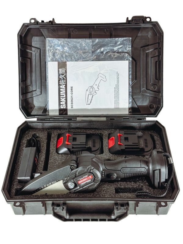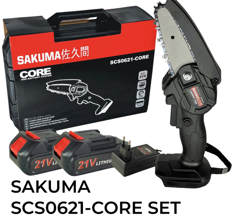 SAKUMA SYSTEM CORE 21 SCS0621-CORE Аккумуляторная цепная пилка. Технические характеристики Скорость движения цепи 10 м/с. Двигатель 21В. Максимальный диаметр распила 100 мм. Длина шины 100мм (макс. 200мм). Шаг цепи 1/4" Питание от батарей 18-21В. Вес без батареи – 0,75 кг. Вес из батарей 2Ач – 1,1 кг. Преимущества ● Аккумуляторная цепная пила SAKUMA SCS0621-CORE совместима со всеми батареями системы TITAN CORE 21, а также с помощью системы адаптеров можно использовать батареи от 18В до 21В, почти всех производителей аккумуляторного инструмента (адаптеры поставляются опционально). Внимание!!!! Аккумуляторную цепную пилу SAKUMA SCS0621-CORE, нельзя использовать с батареями Makita и Titan, без соответствующей переработки. При подключении батареи, пила сразу начинает работать, что может привести к травме!!!!! ● Аккумуляторная цепная пила оснащена мощным двигателем постоянного тока с высоким КПД, что обеспечивает большую мощность. ● Аккумуляторная цепная пила имеет малый вес, всего 1,1 кг включая батарею 2Ач, сбалансированная конструкция позволяет комфортно работать одной рукой. ● Выключатель с блокировкой от случайного пуска, для комфорта и безопасности пользователя. ● Защита от переразряда батареи. ● Возможность использования аккумуляторов от 2 до 12 Ач. Комплектация ● Аккумуляторная цепная пила SAKUMA SCS0621-CORE - 1шт. ● Направляющая шина 100мм – 1шт. ● Цепь 100мм - 1шт. ● Тюбик для смазки - 1шт. ● Отвертка – 1шт. ● Пластиковый кейс – 1шт. ● Зарядное устройство и 2шт аккумулятор 2ah (В комплект входят 2 аккумулятора по 2Ah + зарядка)