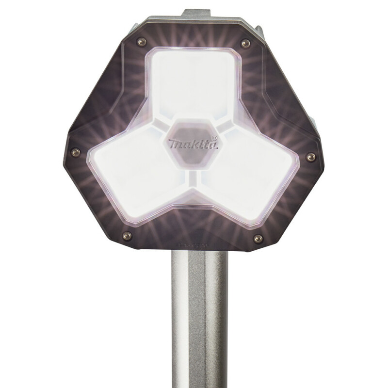 Аккумуляторный фонарь со стойкой Makita DML813: Преимущества Мощный строительный фонарь на компактной складной треноге. Работает от 1 батареи LXT (14,4/18 В). Лампа-тренога легко складывается и раскладывается (в течение 20 секунд!) и весит всего 8 кг с аккумулятором, благодаря этому NLADML813 легко перемещать. 3 режима яркости: Низкая (900 люмен). Время работы: 8,5–10 часов (BL1850) Средняя (1700 люмен) Время работы: 4,5–5,5 часов (BL1850) Высокая (3000 люмен) Время работы: 2,5–3,5 часа (BL1850) NLADML813 излучает белый свет, сравнимо с дневным светом. Оснащен 12 светодиодами. Устойчива к брызгам воды и пыли, что делает фонарь пригодным для тяжелых условий работы. Отличие DML813 и DML814: у них одинаковая база. DML813 оснащен поворотным прожектором. DML814 оснащен поворотным прожектором с 3 отдельными лампами, которые можно использовать в качестве лампы окружающего освещения. Лампы также идентичны между собой по светоотдаче и времени горения. Лампа имеет следующие размеры; В сложенном виде: высота стоя 1000 мм с подножкой 260 мм на 216 мм. В полностью выдвинутом состоянии: высота стоя 2240 мм с размером подножки 573 мм на 658 мм. Вес составляет 7,2 кг без аккумулятора и 7,8 кг с BL1850. Лампа-тренога имеет прочное основание, состоящее из трех складных ножек. В этих ножках сделано углубление, с помощью которого светильник можно прочно прикрепить к земле Технические характеристики Напряжение аккумулятора 14/18 В Тип аккумулятора Li-ion Мощность светодиода 27 Вт х12 шт Световой поток 900 / 1700 / 3000 Люмен Модель NLADML813 Макс. время свечения без подзарядки от BL1850B до 10 часов Вес без аккумулятора 7,2 кг Комплект поставки Обратите внимание, аккумулятор и зарядное устройство в комплект поставки не входят