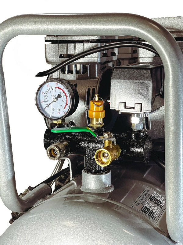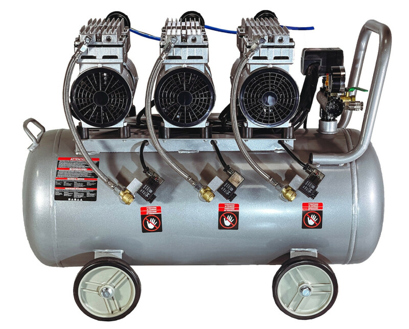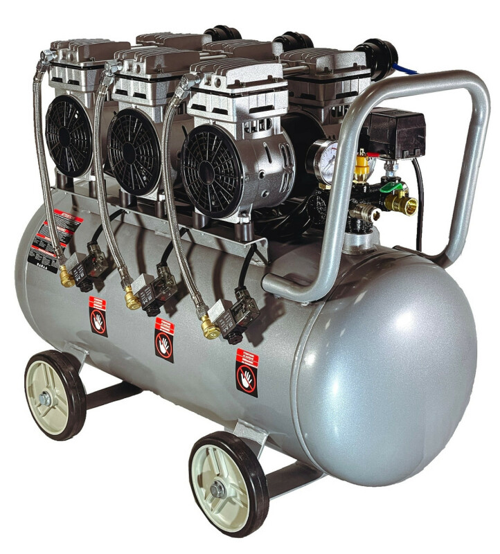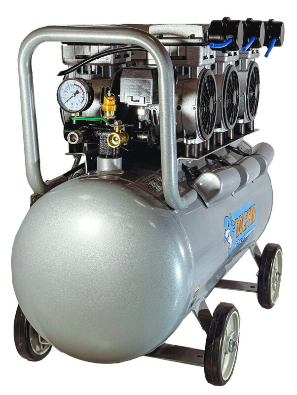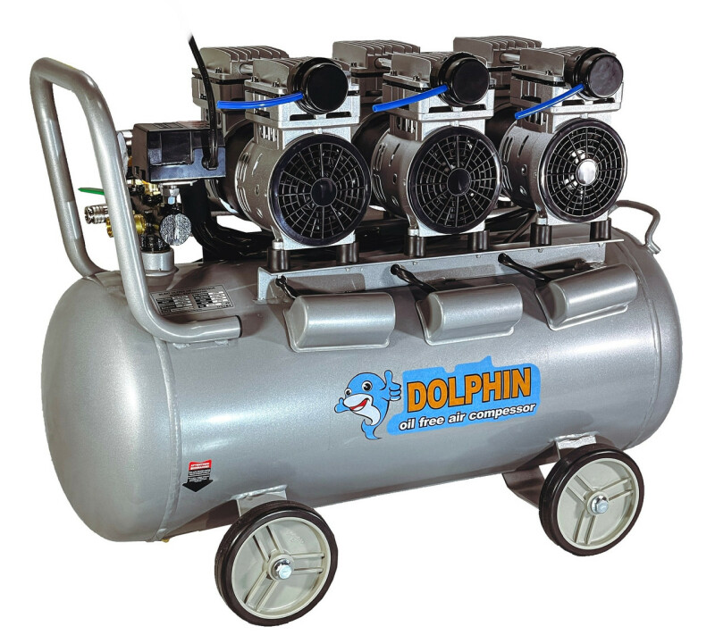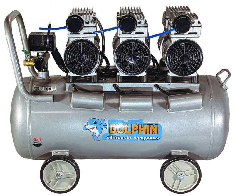 Dolphin Silver Line. Бесшумный, без масляный компрессор Dolphin SZW3850AF090 Технические характеристики Мощность - 3*0,85кВт. Напряжение питающей сети: 220В/50Гц. Рабочее давление. 0-8Бар. Объем ресивера. 90л. Производительность на входе. 615 л/мин. (3*205) Производительность на выходе. 444 л/мин. (3*125) Диаметр поршня. 63.7мм. Количество поршней. 3*2. Ход поршня. 14мм. Частота вращения. 1400 об/мин. Диаметр резьбового соединения для фильтра. Уровень шума. 70дБ. Класс защиты - IP21. Вес компрессора. 62,7кг. Габаритные размеры компрессора 820мм*400мм*620мм. Длина кабеля. 1.3м. Преимущества ● Без масляный компрессор «сухого сжатия» Dolphin SZW3850AF090, в отличие от маслонаполненного, обеспечивает выработку жатого воздуха очень высокой степени чистоты, в нем не содержится песок и твердые частицы грязи, пыль и масляные пары, благодаря данной особенности компрессор – востребован там, где предъявляются высокие требования к качеству воздуха -для чувствительного и высокотехнологичного оборудования, в медицинской, пищевой и электронной промышленности. ● Очень низкий уровень шума всего 70дБ, можно использовать компрессор в помещений. ● Цилиндры компрессорного блока с тефлоновым покрытием, самосмазывающиеся поршневые кольца изготовлены из фторопластовых композитных материалов с очень низким коэффициентом трения, что позволяет не проводить дополнительного обслуживания и продлевают срок эксплуатации. ● Подшипники качения электродвигателя и шейки коленчатого вала выполнены закрытыми и не требуют ухода при эксплуатации. ● Электродвигатель имеет тепловую защиту. ● Ресивер изнутри покрыт эпоксидным покрытием. Есть кран для слития конденсата. ● В основе создания бесшумного без масляного компрессора Dolphin SZW3850AF090, лежат принципиально новая конструкция поршневого блока, которая с одной стороны позволяют сохранить достаточную для работы производительность, но при этом снижают уровень шума при работе компрессора. ● Компрессор выполнен в профессиональном компактном исполнении, имеет два цилиндра c электродвигателем, установленных на ресивере. Все детали компрессора изготовлены в соответствии с международными стандартами DIN и ISO, что обеспечивает их полную взаимозаменяемость при ремонте, прост и удобен в эксплуатации. ● Компрессорный блок закреплен на ресивере на шпильках с резиновыми вставками, это значительно снижает вибрацию и шум. ● В комплекте воздушный фильтр со сменным элементом в металлическом корпусе, более прочный в отличии от хрупких пластиковых аналогов. ● Небольшой вес, компактные габаритные размеры. ● Воздух на выходе остается чистым, так как компрессор не использует смазочные материалы Комплектация ● Компрессор Dolphin SZW3850AF090 1шт. ● Воздушный фильтр в металлическом корпусе 1шт. ● Инструкция по эксплуатации. ● В комплекте колеса транспортировочные 4шт.