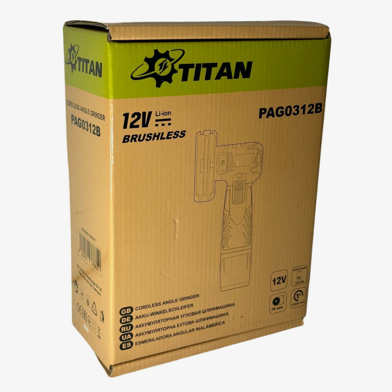 TITAN Профессиональная серия. PAG0312B Brushless Аккумуляторная угловая шлифмашина. Технические характеристики Частота вращения на холостом ходу - 20000 об/мин. Бесщеточный двигатель - 12В. Диаметр диска - 76 мм. Диаметр посадочного места диска - 10мм. Глубина пропила - 16 мм. Резьба шпинделя М5. Питание от батарей - 12В. Размеры упаковки (Д х Ш х В) - 240 x 170 x 90 мм Вес упаковки 0,9 кг. Вес шлифмашины с батарей 2Ач - 0,61 кг. Преимущества ● Аккумуляторная мини угловая шлифмашина TITAN PAG0312B подходит для резки, обдирки различных материалов. Компактная и легкая. ● В аккумуляторной болгарке TITAN PAG0312B установлен современный бесщеточный двигатель с высоким КПД, обеспечивающий большую мощность и продолжительность работы без подзарядки. Не требует технического обслуживания. ● Миниатюрные размеры, длина 202 мм и вес 610г в месте с батареей. ● Болгарка комфортно лежит в руке, обхват корпуса, всего 155мм (диаметр 49мм), позволяет длительное время работать не уставая. ● Электронный тормоз двигателя, обеспечивает мгновенную остановку вращения при выключении инструмента. ● Всторенная защита от переразряда батареи. ● Эргономичный дизайн с мягкой прорезиненной ручкой, не скользит в руке. ● Литий-ионный аккумулятор напряжением 12В емкостью 2 Ач, без эффекта памяти, можно заряжать и использовать при любом уровне заряда. ● Кнопка блокировки шпинделя, для легкой смены инструмента. ● Дополнительный защитный кожух легко регулируется без инструментов. Просто проворачивается до нужного положения. ● Машинка поставляется в удобной фирменной сумке с карманами для хранения аксессуаров. Комплектация ● Угловая шлифмашина TITAN PAG0312B. ● Шлифовальный диск 1,2х76мм -1шт. ● Батарея -2шт. ● Зарядное устройство -1шт. ● Защита 76мм -1шт. ● Дополнительная защита -1шт. ● Ключ 1шт. ● Инструкция. ● Сумка.
