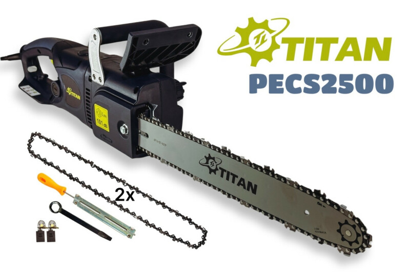 Электропила цепная TITAN PECS2500 — надежный инструмент для пилки древесины, обрезки веток, заготовки дров и проведению разнообразных строительных работ связанных с распилом древесины в бытовых условиях. Особенности электропилы цепной TITAN PECS2500: Автоматическая смазка цепи; Механический тормоз выбега цепи; Блокировка случайного запуска Низкий уровень вибрации; Удобная прорезиненная передняя рукоятка; Повышенный ресурс двигателя; Прочный корпус из ударопрочного пластика. Комплект поставки: Электропила цепная TITAN PECS2500; Шина 40 см; Цепь 40 см ×2; Пластиковый чехол; Напильник с направляющей рамкой; Запасные угольные щетки; Инструкция по эксплуатации; Гарантийный талон; Упаковка – картонная коробка. Характеристики Производитель: TITAN Напряжение питания: 220 В Частота тока: 50 Гц Мощность: 2400 Вт Тип двигателя: щеточный Скорость движения цепи: 800 м/мин Длина шины: 400 мм Шаг цепи: 3/8” Автоматическая смазка цепи: да Уровень шума: 101 дБ Вес нетто/брутто: 5,2 /5,9 кг Габариты упаковки: 565×360×235 мм Гарантия: 12 месяцев