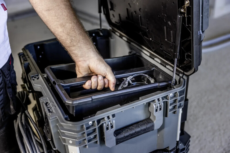Инструменты и аксессуары можно легко транспортировать на строительную площадку с помощью надежной системы хранения и транспортировки STACK PACK. Ящики изготовлены из ударопрочного пластика с углами, усиленными алюминием, что защищает инструменты и аксессуары от самых тяжелых условий строительной площадки. Ящики имеют прочную металлическую защелку и дополнительные ручки, обеспечивающие гибкое и удобное обращение. Быстроразъемные соединения с блокировкой позволяют быстро, гибко и легко соединить отдельные коробки, чтобы систему хранения можно было собрать в соответствии с конкретными потребностями пользователя. Средний бокс с газовыми амортизаторами, обеспечивающими его открытое положение, и съемным контейнером для аксессуаров.