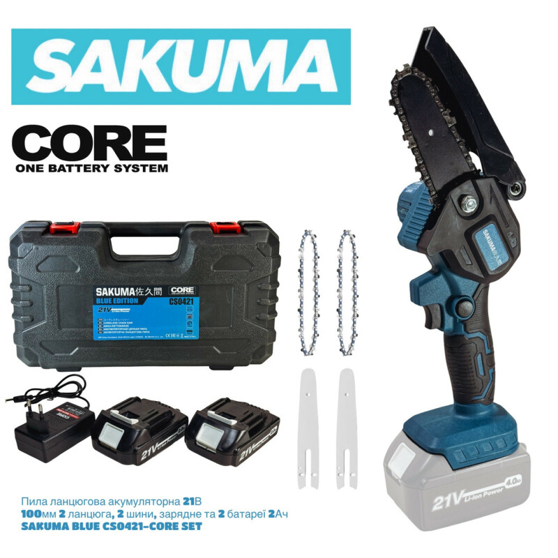 Аккумуляторная цепная пила SAKUMA BLUE CS0421-CORE SET в комплекте, зарядное устройство и 2 аккумулятора 2Ач