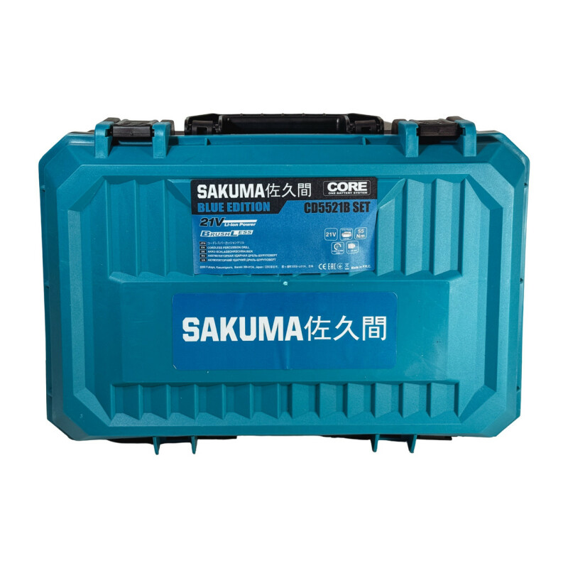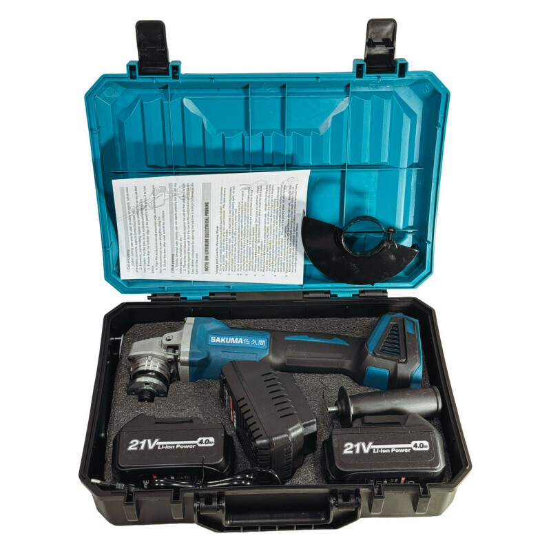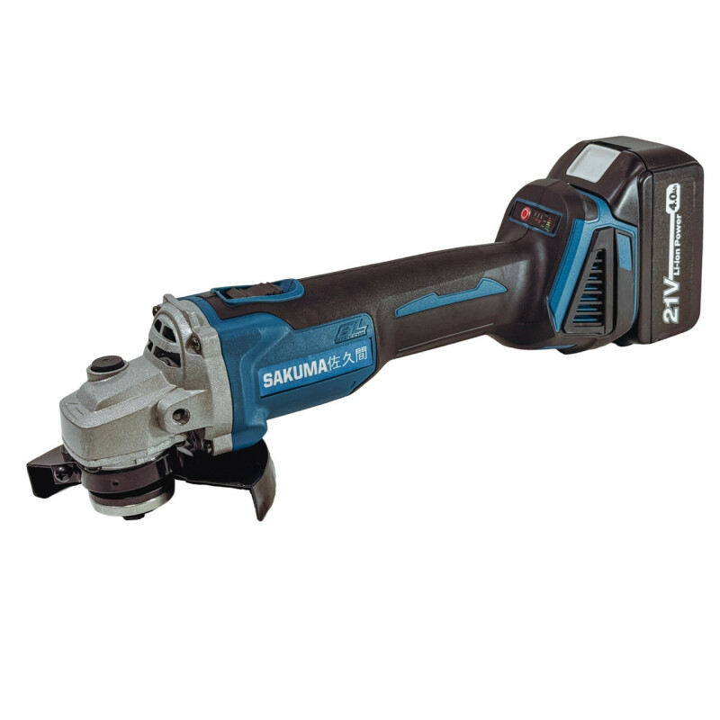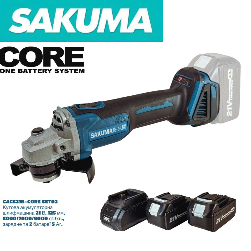 SAKUMA BLUE SYSTEM CORE 21 CAG521B-CORE Brushless Аккумуляторная угловая шлифмашина. Технические характеристики Частота вращения на холостом ходу – 5000/7000/9000 об/мин. Бесщеточный двигатель – 21В. Диаметр диска – 125мм. Диаметр посадочного места диска – 22,2мм. Резьба шпинделя – М14. Обхват корпуса – 47мм. Питание от батарей – 18-21В Размеры (Д х Ш х В) – 362 x 140 x 145 мм Вес без батарей и аксессуаров – 1,5кг. Вес из батарей 4Ач – 2,0.кг Преимущества ● Аккумуляторная угловая шлифмашина CAG521B-CORE совместима со всеми батареями системы SAKUMA BLUE CORE 21, а также с помощью системы адаптеров, можно использовать батареи от 18В до 21В, почти всех производителей аккумуляторного инструмента (адаптеры поставляются опционально). ● В аккумуляторной болгарке SAKUMA BLUE CAG521B-CORE установлен современный бесщеточный двигатель с высоким КПД, обеспечивающий большую мощность и длительность работы без подзарядки. Не требует технического обслуживания. ● Intelligent Control System - Смарт-система выбора скорости с сенсорным управлением и светодиодной индикацией. ● Защита от переразряда батареи. ● Эргономичный дизайн с мягкой прорезиненной ручкой, не скользит в руке и гасит вибрацию. ● Болгарка комфортно лежит в руке, обхват корпуса, всего 47мм, позволяет длительное время работать не уставая. ● Кнопка блокировки шпинделя для легкого изменения инструмента. Комплектация ● Угловая шлифмашина SAKUMA BLUE CAG521B-CORE. ● Защита 125мм -1шт. ● Дополнительная ручка -1шт. ● Ключ 1шт. ● Гайка М14 -1шт. ● Фланец 22,2 мм -1шт. ● Инструкция. ● Пластиковый чемодан.