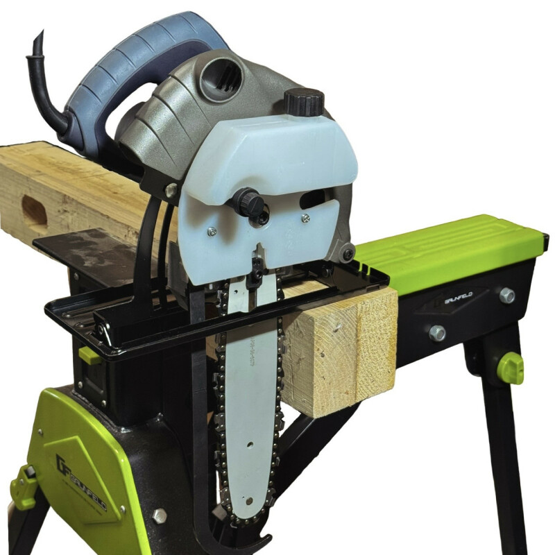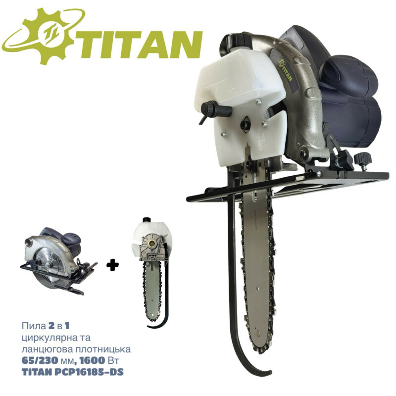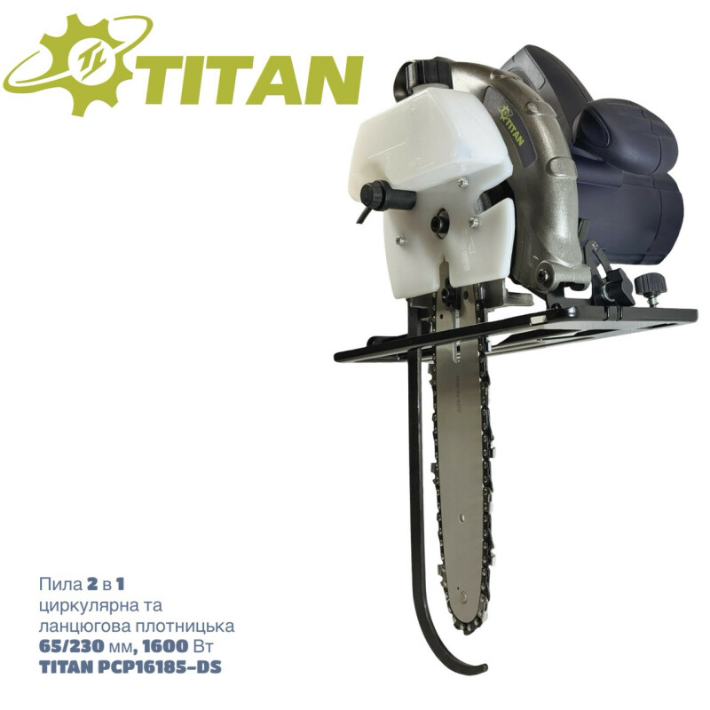 TITAN Профессиональная серия. Пила 2 в 1 циркулярная и цепная плотничная TITAN PCP16185 DS+USSN156 Технические характеристики Мощность двигателя: 1600 Вт. Напряжение: 230В/50 Гц. Частота вращения без погрузки: 5000 об/мин. Диаметр диска: 185 мм. Внутренний диаметр пильного диска: 20 мм. Максимальная глубина пропила под 90º: 65 мм. Максимальная глубина пропила под 45º: 51 мм. Длина шины: 270 мм. Цепь: 3/8", z45. Максимальная толщина реза под 90º (цепная пилка): 230 мм. Максимальная толщина реза под 45º (цепная пилка): 180 мм. Посадочное место ведущей шестерни: 13,5х14,8 мм. Объем масляного бака: 120 мл. Скорость движения цепи: 11 м/сек. Вес циркулярной пилы: 4,8 кг. Вес цепной пилы в сборе: 5,8 кг. Описание ● Пила TITAN PCP16185 DS – это универсальный инструмент, включающий циркулярную пилу PCP16185 и цепную насадку USSN156. Устройство легко трансформируется из обычной циркулярной пилы в цепную плотничную пилу и обратно. Для преобразования достаточно снять пильный диск и установить на его место цепную насадку. Этот функционал делает пилу удобной и практичной для выполнения различных задач, обеспечивая максимум производительности и гибкости в работе. ● Максимальная толщина реза для цепной пилы составляет: под прямым углом 230 мм и 180 мм под 45º, это позволяет легко и точно делать прямые косые пропилы для плотниковых соединений. ● Автоматическая подача масла из масляного резервуара для непрерывной смазки цепи. ● Конструктивный аналог модели Kress 1400 DS Duo Sage. ● Детали изготовлены из качественных материалов, что гарантирует длительный срок службы аппарата. ● Постоянное воздушное охлаждение держит в норме температуру двигателя. ● Хорошая система масла исключает трение шестерен. ● Эргономичный дизайн с мягкой прорезиненной ручкой, способствуют надежному хвату и полному контролю над пилой. ● Возможность подключения пылесоса сэкономить час для уборки мастерской. ● Рычаг защиты от случайного запуска сохранит здоровье и конечности столяра. ● Универсальная пилка 2 в 1 циркулярная и цепная плотничная TITAN PCP16185 DS – это незаменимый инструмент для профессионалов и любителей, ценящих скорость и точность при распылении бревен и древесины большой толщины. Комплектация ● Циркулярная пилка PCP16185 - 1шт. ● Твердосплавный диск 185мм – 1шт. ● Параллельный упор – 1шт. ● Ключ накидной – 1шт. ● Корпус механизма с маслобаком – 1шт. ● Пыльная шина - 1шт. ● Пильная цепь - 1шт. ● Ведущая звездочка – 1шт. ● Комплект крепления - 1шт. ● Пластиковый защитный кожух на шину - 1шт. ● Ключ шестигранный – 1шт. ● Инструкция – 1шт. ● Упаковка – 1шт. ● Дисковая пилка в комплект не входит. Дополнительная информация: ● Производитель: TM "TITAN" I.P.A. GmbH Plauerhaeger Str. 26. 19395, Plau Am See, Германия ● Модель: PCP16185-DS. ● Артикул: 201609070_DS.