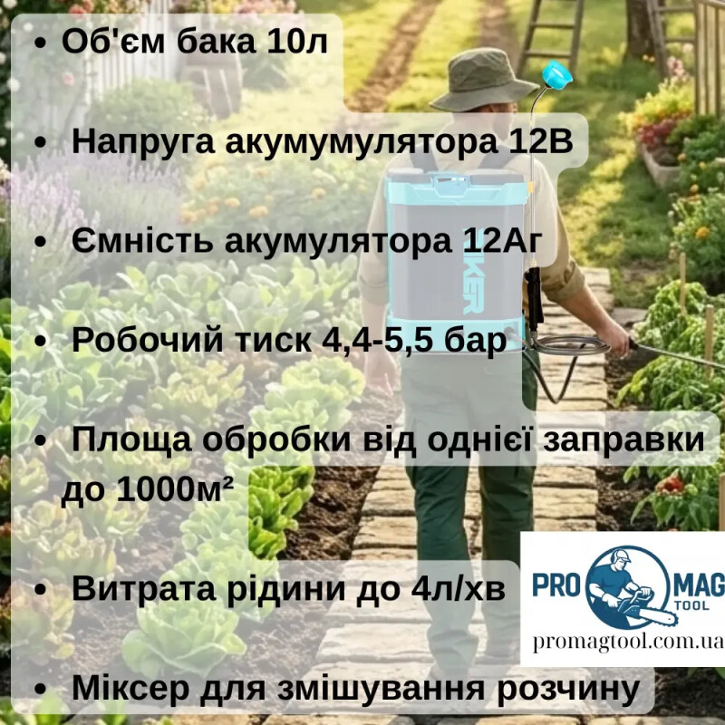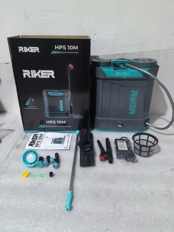 Аккумуляторный опрыскиватель RIKER HPS 10M (RK0143) со встроенным миксером RIKER HPS 10M — это профессиональное решение для ухода за вашим садом и огородом. Главная особенность этой модели — встроенный миксер, который постоянно перемешивает рабочий раствор, предотвращая оседание препаратов и обеспечивая равномерную концентрацию от первой до последней капли. Ключевые преимущества: Инновационный миксер: Больше не нужно встряхивать опрыскиватель вручную — техника сама заботится об идеальной однородности смеси. Высокая автономность Благодаря аккумулятору емкостью 12 Аг, вы можете работать часами без подзарядки. Максимальная площадь обработки: Мощная помпа позволяет обработать до 1000 м² всего от одной заправки. Мощное давление: Рабочий диапазон 4,4–5,5 бар обеспечивает мелкодисперсное распыление, которое проникает даже в труднодоступные места растений. Экономичность: Расход жидкости к 4 л/мин позволяет эффективно использовать дорогие препараты. Технические характеристики: Объем бака: 10 литров Напруга акумулятора: 12 В Емкость аккумулятора: 12 Аг Рабочее давление: 4,4 – 5,5 бар Расход жидкости: до 4 л/мин Площадь обработки: до 1000 м2 Особенность: Система принудительного смешивания раствора (Миксер) Артикул: RK0143 Аккумуляторный опрыскиватель RIKER HPS 10M (RK0143) со встроенным миксером