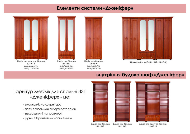 В связи с нестабильностью курса, а так же частыми повышениями цен на фабрике, просьба уточнять цены. Дополнительная информация: Петли с газовыми амортизаторами Телескопические направляющие Ручки с бронзовым напылением Наименование: Размер (ШхВхГ): Цвет: Цена: Шкаф Дженифер Ш-1617 920х2130х630 1. Орех итальянский 5710 грн 2. Акация 5710 грн 3. Белый антик 6150 грн