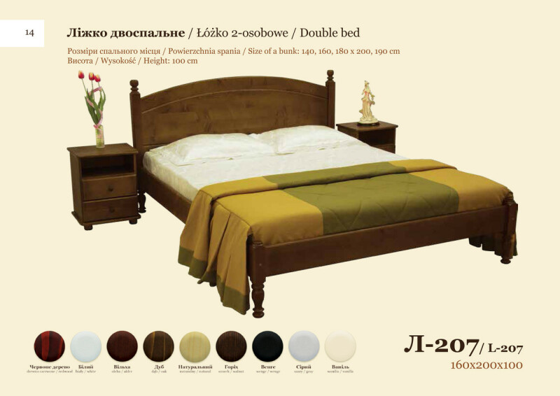 В связи с нестабильностью курса, а так же частыми повышениями цен на фабрике, просьба уточнять цены. С Уважением Интернет-магазин - mebel1.od.ua Наименование: Размер (ШхВхГ): Цвет: Кровать "Л-207" 1600х1000х2000 1. Красное дерево 2. Белый + 20% к цене 3. Ольха 4. Дуб 5. Натуральный 6. Орех 7. Венге тёмный + 10% к цене 8. Серый + 10% к цене 9. Ваниль + 20 % к цене