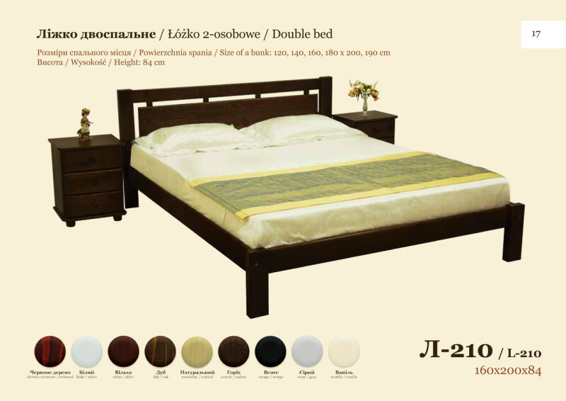ИНФОРМАЦИЯ ДЛЯ ЗАКАЗА: 1. ПЕРЕД ЗАКАЗОМ: УТОЧНЯЙТЕ НАЛИЧИЕ И ЦЕНУ / не оставляйте заказ, не убедившись в его наличии и актуальной цены! 2. г. Одесса: Доставка осуществляется БЕЗ ПРЕДОПЛАТЫ / стоимость доставки оговаривается индивидуально! 3. НОВАЯ ПОЧТА: Отправка осуществляется только после ПОЛНОЙ 100% оплаты / доставку оплачивает заказчик! Наименование: Размер (ШхВхГ): Цвет: Цена: Кровать "Л-210" 1200х840х2000 1. Красное дерево 6670 грн 1400х840х200 2. Белый + 20% к цене 6820 грн 1600х840х200 3. Ольха 7000 грн 4. Дуб 5. Натуральный 6. Орех 7. Венге тёмный + 10% к цене 8. Серый + 10% к цене 9. Ваниль + 20 % к цене