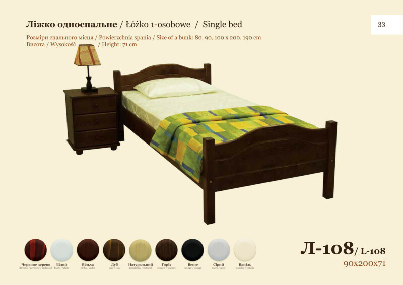 В связи с нестабильностью курса, а так же частыми повышениями цен на фабрике, просьба уточнять цены. С Уважением Интернет-магазин - mebel1.od.ua Наименование: Размер (ШхВхГ): Цвет: Кровать "Л-108" 900х680х2000 1. Красное дерево 2. Белый + 20% к цене 3. Ольха 4. Дуб 5. Натуральный 6. Орех 7. Венге тёмный + 10% к цене 8. Серый + 10% к цене 9. Ваниль + 20 % к цене