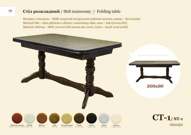 В связи с нестабильностью курса, а так же частыми повышениями цен на фабрике, просьба уточнять цены. С Уважением Интернет-магазин - mebel1.od.ua Наименование: Размер (ШхВхГ): Цвет: Стол раскладной "СТ-1" 1600(2000)х900 1. Красное дерево 2. Белый + 20% к цене 3. Ольха 4. Дуб 5. Натуральный 6. Орех 7. Венге тёмный + 10% к цене 8. Серый + 10% к цене 9. Ваниль + 20 % к цене