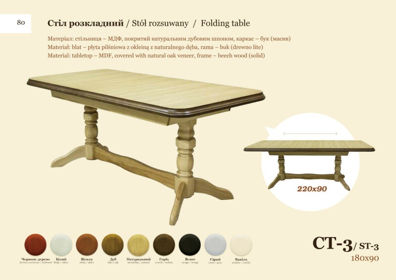 В связи с нестабильностью курса, а так же частыми повышениями цен на фабрике, просьба уточнять цены. С Уважением Интернет-магазин - mebel1.od.ua Наименование: Размер (ШхВхГ): Цвет: Стол раскладной "СТ-3" 1800(2200)х900 1. Красное дерево 2. Белый + 20% к цене 3. Ольха 4. Дуб 5. Натуральный 6. Орех 7. Венге тёмный + 10% к цене 8. Серый + 10% к цене 9. Ваниль + 20 % к цене
