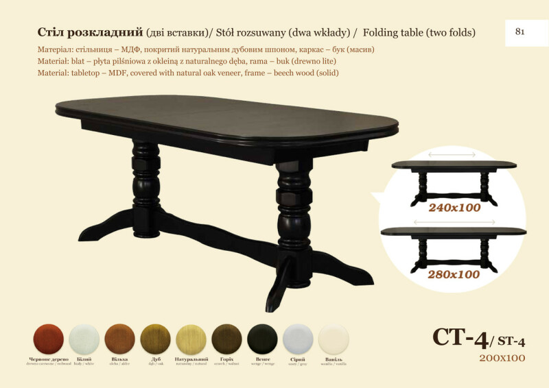 В связи с нестабильностью курса, а так же частыми повышениями цен на фабрике, просьба уточнять цены. С Уважением Интернет-магазин - mebel1.od.ua Наименование: Размер (ШхВхГ): Цвет: Стол раскладной две вставки "СТ-4" 2000х1000 1. Красное дерево Стол в разложенном виде 2400-2800х1000 2. Белый + 20% к цене 3. Ольха 4. Дуб 5. Натуральный 6. Орех 7. Венге тёмный + 10% к цене 8. Серый + 10% к цене 9. Ваниль + 20 % к цене