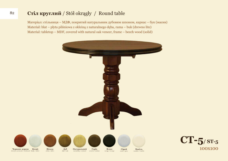 В связи с нестабильностью курса, а так же частыми повышениями цен на фабрике, просьба уточнять цены. С Уважением Интернет-магазин - mebel1.od.ua Наименование: Размер (ШхВхГ): Цвет: Стол круглый "СТ-5" 1000х1000 1. Красное дерево 2. Белый + 20% к цене 3. Ольха 4. Дуб 5. Натуральный 6. Орех 7. Венге тёмный + 10% к цене 8. Серый + 10% к цене 9. Ваниль + 20 % к цене