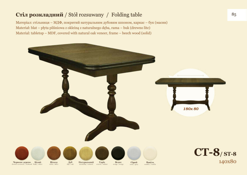 В связи с нестабильностью курса, а так же частыми повышениями цен на фабрике, просьба уточнять цены. С Уважением Интернет-магазин - mebel1.od.ua Наименование: Размер (ШхВхГ): Цвет: Стол раскладной "СТ-8" 1400(1800)х800 1. Красное дерево 2. Белый + 20% к цене 3. Ольха 4. Дуб 5. Натуральный 6. Орех 7. Венге тёмный + 10% к цене 8. Серый + 10% к цене 9. Ваниль + 20 % к цене