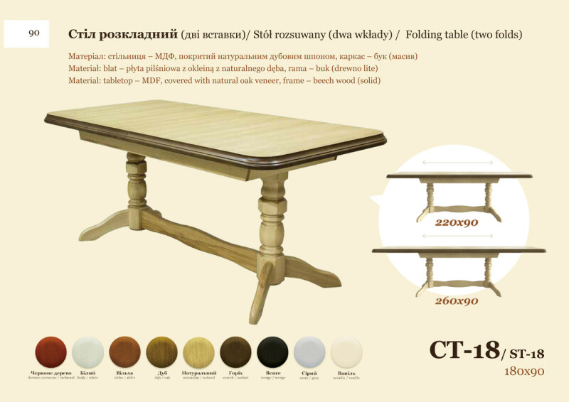 В связи с нестабильностью курса, а так же частыми повышениями цен на фабрике, просьба уточнять цены. С Уважением Интернет-магазин - mebel1.od.ua Наименование: Размер (ШхВхГ): Цвет: Стол раскладной две вставки "СТ-18" 1800х900 1. Красное дерево Стол в разложенном виде 2200-2600х900 2. Белый + 20% к цене 3. Ольха 4. Дуб 5. Натуральный 6. Орех 7. Венге тёмный + 10% к цене 8. Серый + 10% к цене 9. Ваниль + 20 % к цене
