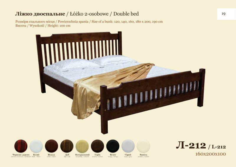 В связи с нестабильностью курса, а так же частыми повышениями цен на фабрике, просьба уточнять цены. С Уважением Интернет-магазин - mebel1.od.ua Наименование: Размер (ШхВхГ): Цвет: Кровать "Л-212" 1600х1000х2000 1. Красное дерево 2. Белый + 20% к цене 3. Ольха 4. Дуб 5. Натуральный 6. Орех 7. Венге тёмный + 10% к цене 8. Серый + 10% к цене 9. Ваниль + 20 % к цене