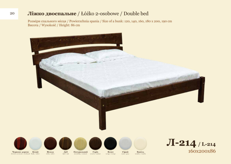 В связи с нестабильностью курса, а так же частыми повышениями цен на фабрике, просьба уточнять цены. С Уважением Интернет-магазин - mebel1.od.ua Наименование: Размер (ШхВхГ): Цвет: Кровать "Л-214" 1600х860х2000 1. Красное дерево 2. Белый + 20% к цене 3. Ольха 4. Дуб 5. Натуральный 6. Орех 7. Венге тёмный + 10% к цене 8. Серый + 10% к цене 9. Ваниль + 20 % к цене