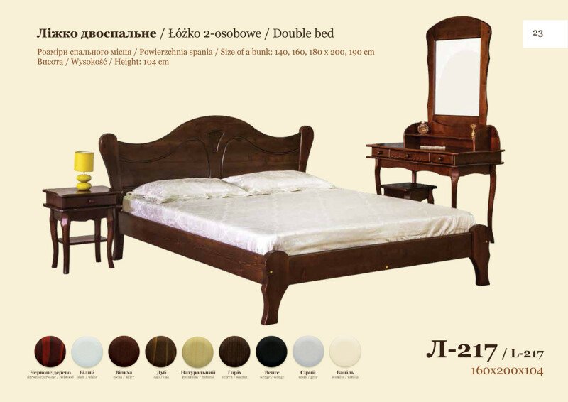 В связи с нестабильностью курса, а так же частыми повышениями цен на фабрике, просьба уточнять цены. С Уважением Интернет-магазин - mebel1.od.ua Наименование: Размер (ШхВхГ): Цвет: Кровать "Л-217" 1600х1040х2000 1. Красное дерево 2. Белый + 20% к цене 3. Ольха 4. Дуб 5. Натуральный 6. Орех 7. Венге тёмный + 10% к цене 8. Серый + 10% к цене 9. Ваниль + 20 % к цене