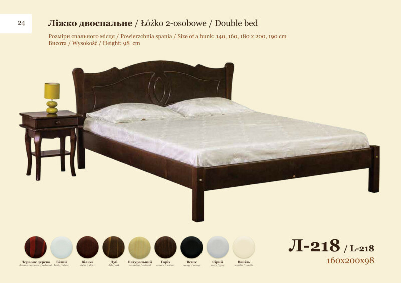 Наименование: Размер (ШхВхГ): Цвет: Кровать "Л-218" 1600х980х2000 1. Красное дерево 2. Белый + 20% к цене 3. Ольха 4. Дуб 5. Натуральный 6. Орех 7. Венге тёмный + 10% к цене 8. Серый + 10% к цене 9. Ваниль + 20 % к цене