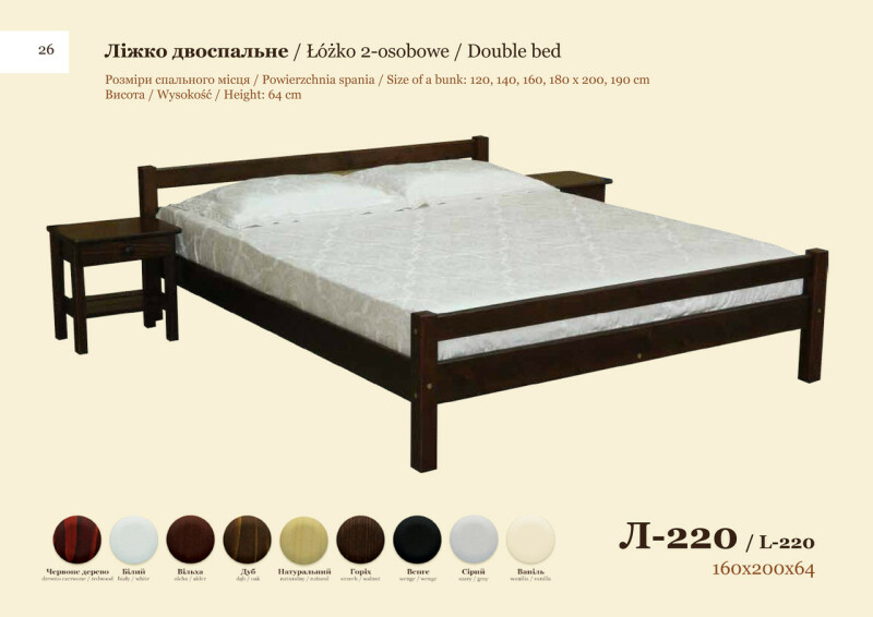 ИНФОРМАЦИЯ ДЛЯ ЗАКАЗА: 1. ПЕРЕД ЗАКАЗОМ: УТОЧНЯЙТЕ НАЛИЧИЕ И ЦЕНУ / не оставляйте заказ, не убедившись в его наличии и актуальной цены! 2. г. Одесса: Доставка осуществляется БЕЗ ПРЕДОПЛАТЫ / стоимость доставки оговаривается индивидуально! 3. НОВАЯ ПОЧТА: Отправка осуществляется только после ПОЛНОЙ 100% оплаты / доставку оплачивает заказчик! Наименование: Размер (ШхВхГ): Цвет: Кровать "Л-220" 1600х640х2000 1. Красное дерево 2. Белый + 20% к цене 3. Ольха 4. Дуб 5. Натуральный 6. Орех 7. Венге тёмный + 10% к цене 8. Серый + 10% к цене 9. Ваниль + 20 % к цене