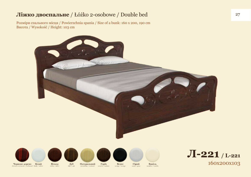 В связи с нестабильностью курса, а так же частыми повышениями цен на фабрике, просьба уточнять цены. С Уважением Интернет-магазин - mebel1.od.ua Наименование: Размер (ШхВхГ): Цвет: Кровать "Л-221" 1600х1030х2000 1. Красное дерево 2. Белый + 20% к цене 3. Ольха 4. Дуб 5. Натуральный 6. Орех 7. Венге тёмный + 10% к цене 8. Серый + 10% к цене 9. Ваниль + 20 % к цене