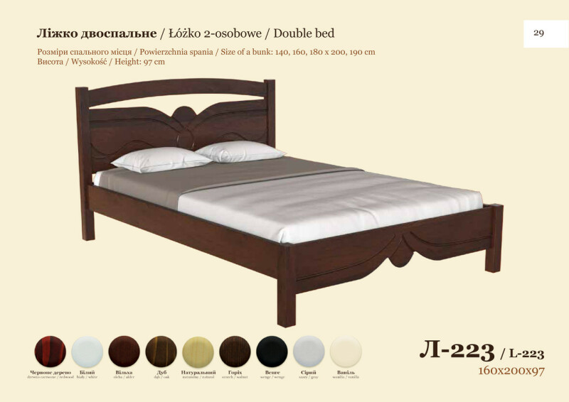 В связи с нестабильностью курса, а так же частыми повышениями цен на фабрике, просьба уточнять цены. С Уважением Интернет-магазин - mebel1.od.ua Наименование: Размер (ШхВхГ): Цвет: Кровать "Л-223" 1600х970х2000 1. Красное дерево 2. Белый + 20% к цене 3. Ольха 4. Дуб 5. Натуральный 6. Орех 7. Венге тёмный + 10% к цене 8. Серый + 10% к цене 9. Ваниль + 20 % к цене