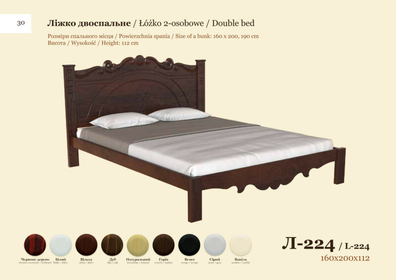 В связи с нестабильностью курса, а так же частыми повышениями цен на фабрике, просьба уточнять цены. С Уважением Интернет-магазин - mebel1.od.ua Наименование: Размер (ШхВхГ): Цвет: Кровать "Л-224" 1600х1120х2000 1. Красное дерево 2. Белый + 20% к цене 3. Ольха 4. Дуб 5. Натуральный 6. Орех 7. Венге тёмный + 10% к цене 8. Серый + 10% к цене 9. Ваниль + 20 % к цене