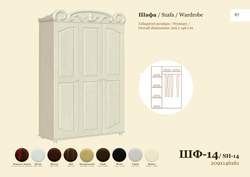 В связи с нестабильностью курса, а так же частыми повышениями цен на фабрике, просьба уточнять цены. С Уважением Интернет-магазин - mebel1.od.ua Наименование: Размер (ШхВхГ): Цвет: Шкаф "ШФ-14" 1460х2090х610 1. Красное дерево 2. Белый + 20% к цене 3. Ольха 4. Дуб 5. Натуральный 6. Орех 7. Венге тёмный + 10% к цене 8. Серый + 10% к цене 9. Ваниль + 20 % к цене