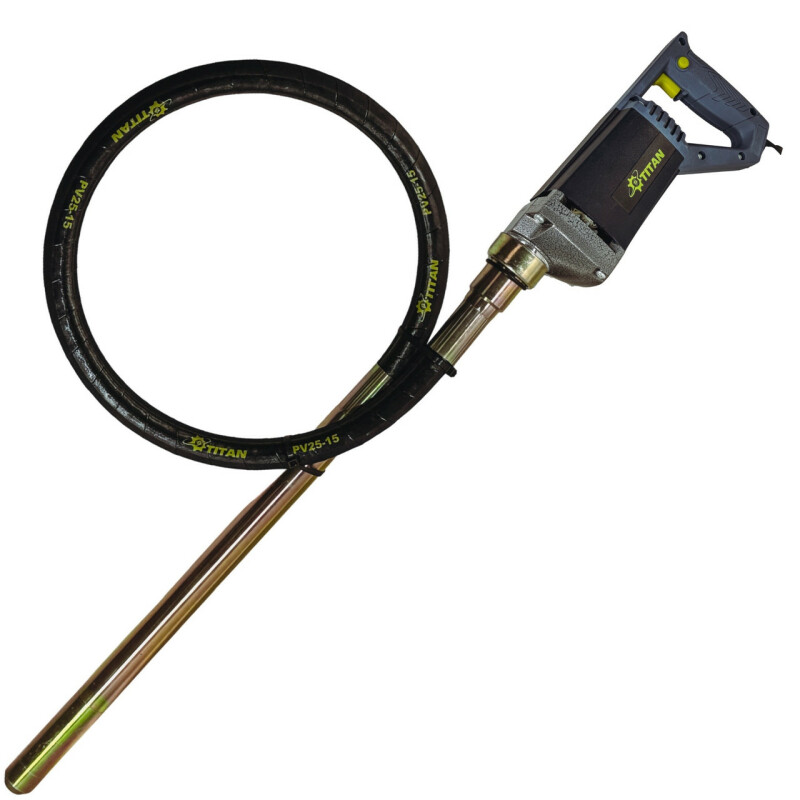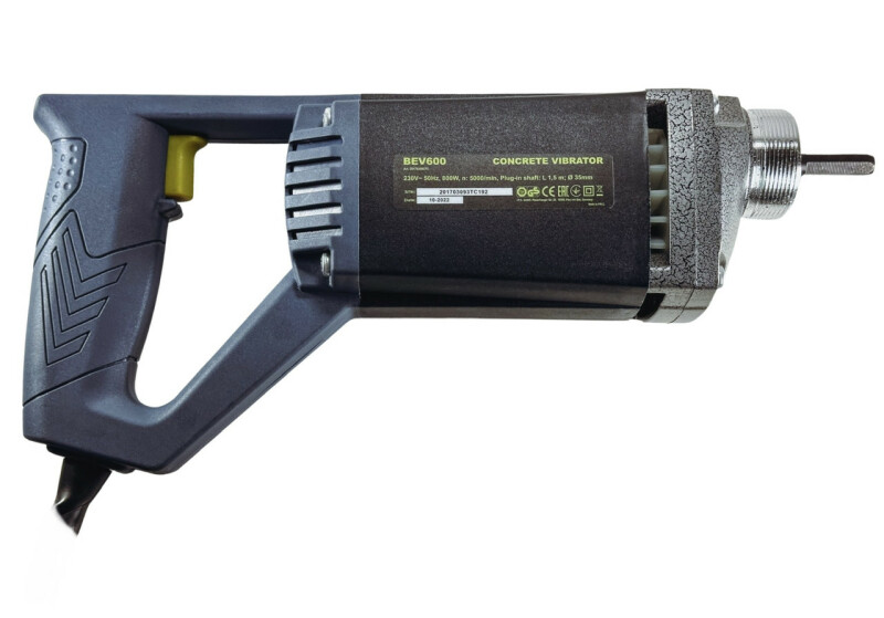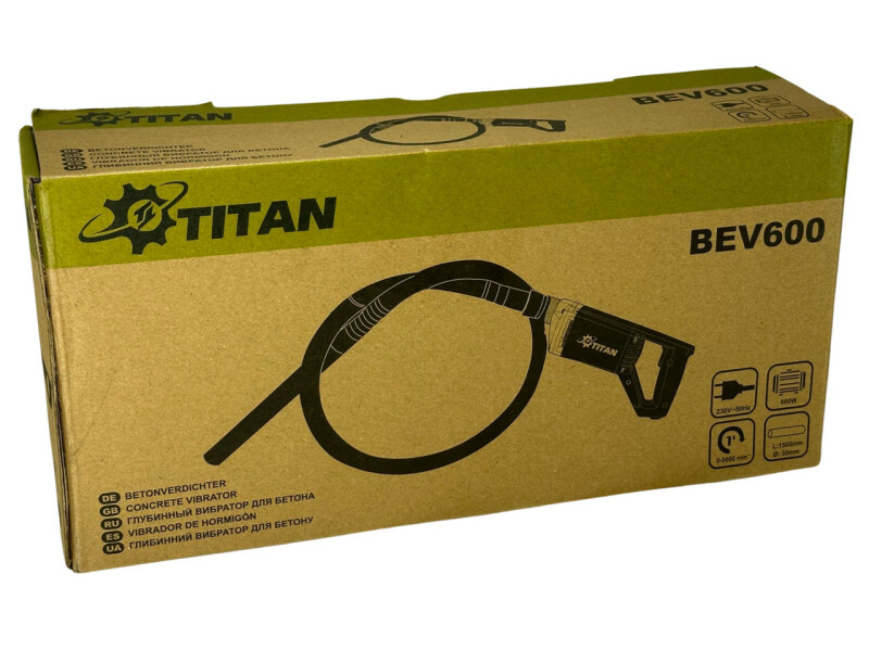 TITAN BEV600, Глубинный вибратор для бетона. Технические характеристики Мощность двигателя - 800Вт. Напряжение - 220В/50Гц. Частота вращения на холостом ходу - 5000 об/мин. Амплитуда колебаний - 1,2мм Радиус распространения колебаний - 40см. Максимальная мощность - 800Вт. Диаметр булавы - 35мм Длина гибкого вала с булавой - 1500мм Длина сетевого кабеля - 2м. Вес - 2,1 кг. Вес с вибробулавой - 6,0 кг. Преимущества ● Вибратор глубинный TITAN BEV600 применяется для создания высококачественного бетона, путем удаления мельчайших пузырьков воздуха, которые в последствии могут привести к уменьшению прочности конструкции. ● Повышенная мощность двигателя (800Вт), позволяет увеличить производительность и продолжительность непрерывной работы. ● Прочный металлический корпус редуктора обеспечивают высокую надежность инструмента. ● Глубинный вибратор TITAN BEV600, оснащен гибким валом длиной 1.5 м., (опционно можно приобрести гибкий вал длиной 3м, TITAN PV35-3) Комплектация ● Вибратор глубинный BEV600 1шт. ● Виброшланг с булавой 2м PV35-15 - 1шт. ● Инструкция по эксплуатации - 1шт. ● Запасные графитовые щётки: 1 пара.