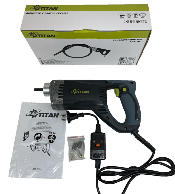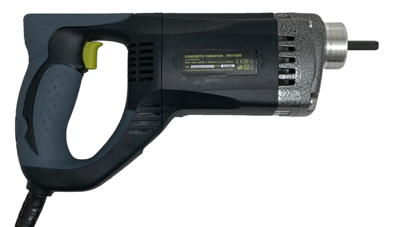Глубинный вибратор для бетона, Мощность 1050Вт, Скорость вращения 5000 об/мин., длина вибрирующего вала 2,0 м, диаметр 35 мм. Защищённая от воды кнопка, резиновый кабель с УЗО. Вал в комплекте.