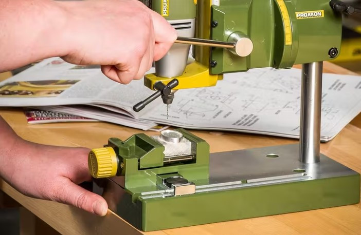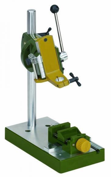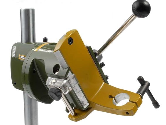 Стальная хромированная опорная колонна 280 х 20 мм, вылет до центра рабочего инструмента 140 мм. Фрезерованный рабочий стол 220 х 120 мм с параллельным ограничителем и линейкой. Отверстия для крепления координатного стола КТ70 и самой станины к рабочей поверхности. Одним из достоинств этой модели является поворотная на 90° головка (шкала нанесена на круглую часть) с направляющими типа "ласточкин хвост", которая позволяет выполнять сверление под углом и различные фрезерные работы. Шкала помогает регулировать глубину обработки. На фрезеровочном столе нанесена метрическая линейка для сверления одинаковых отверстий. Ручка возврата с надежной пружиной, которая не скоро выйдет из строя. Также стоит отметить, что отверстие в головке 20 мм пригодно для установки любых бормашин МІСROMOT, которые используются для сверлильных работ в различных материалах. Компактность и небольшой вес позволят легко ее транспортировать. Отверстия предназначены для установки координатного стола KT 70 и креплению станины к верстаку. стойка изготовлена из литого под давлением алюминия; предназначена для крепления бормашин с шейкой 20 мм; поворотная на 90 ° (с лимбом) головка подходит для сверления под углом и фрезерования; рычаг подачи с возвратной пружиной гарантирует точную и плавную подачу при обработке; стойка оснащена удобной шкалой глубины сверления с настраиваемым ограничением глубины обработки (ход до 40 мм), резьбой для установки координатного стола и отверстиями для крепления стойки к верстаку; размер фрезерованного основания (с направляющей линейкой): 220 х 120 мм; вес: 2200 г.