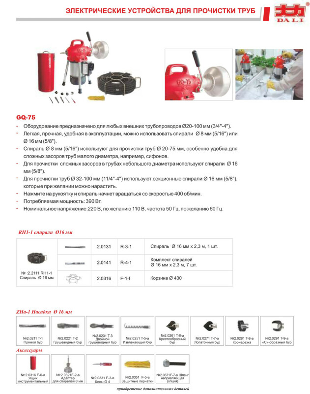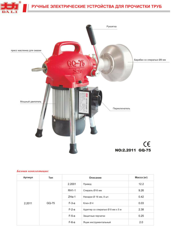 Машина для прочистки канализации и труб DALI GQ-75 (390 Вт, 20-110 мм)