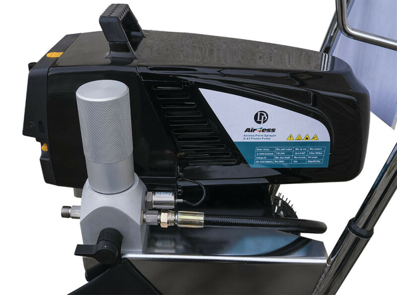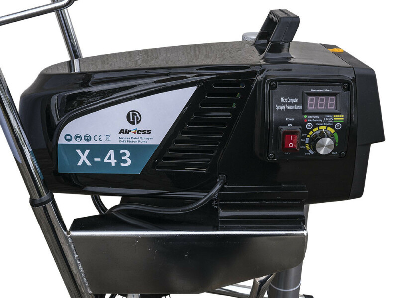 Электрический безвоздушный окрасочный аппарат X-43 Мощность 2500 Вт/3.4 ЛС Напряжение 200-240V/50HZ Максимальный диаметр сопла 0.043" Максимальная длина шланга 120 м Пропускная способность 7.0 л/мин Тип двигателя Бесщеточный Эффективность 25-30 м2/мин Гарантия 1 год Электрический безвоздушный окрасочный аппарат X43 Мощность 2500 Вт/3.4 ЛС Максимальное сопло 0.043 Пропускная способность 7.0 л/мин Аппарат разработан для профессиональных подрядчиков выполняющих большие объемы работ по нанесению всего спектра лакокрасочных материалов от низкой до высокой степени вязкости таких как – все виды красок на водной и масляной основе, латексные краски, эмали, лаки, эпоксидные материалы, холодные мастики, антикоррозионные и огнезащитные составы, шпатлевка, клей, грунтовки и т.д. Особенности 1. Низкое расположение всасывающего клапана и длинный рабочий поршень обеспечивают эффективное всасывание и нагнетание составов высокой вязкости 2. Микропроцессорный контроль давления гарантирует равномерность подачи материала. Микропроцессор регулирует обороты в зависимости от выбранного давления и вязкости подаваемого материала 3. Компенсационная колба с дополнительным фильтром. Создает 5% резерв лакокрасочного материала для исключения пульсации материала, поддерживая превосходную атомизацию и оптимальный расход ЛКМ на протяжении всего рабочего цикла. 4. TEFC приводной мотор обладает повышенным ресурсом, создает более мощный крутящий момент (по сравнению с обычными моторами аналогичной мощности), минимизирует искрение – что особенно важно при работе с лакокрасочными составами на основе растворителей. 5. Полуавтоматическая система смазки. Подача масла на рабочий поршень осуществляется легким нажатием на кнопку перед началом работы, существенно увеличивая ресурс как уплотнительных колец так и рабочего поршня. 6. Система FAST CLEAN . Для быстрой и эффективной очистки насосной системы аппарата просто переведите переключатель в состояние «Промывка». 7. Автоматический контроль оборотов двигателя. Когда в емкости заканчивается краска, микропроцессор автоматически снижает обороты двигателя уберегая поршень и уплотнения от преждевременного износа. 8. Цифровой манометр с электронным табло. Позволяет быстро и точно настроить необходимое давление. 9. Возможна работа на два поста. Мощность аппарата позволяет работать одной машиной двум малярам одновременно, существенно сокращая сроки завершения проекта.