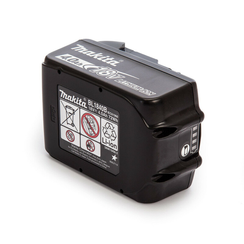 Преимущества: Вес меньше на 40 %, емкость - на 180 % больше (по сравнению с аналогичными Ni-Cd аккумуляторами) Возможность зарядки в любом состоянии (разряженный, полуразряженный...) Постоянный контроль отдельных ячеек при зарядке, для особо долгого срока службы Управление процессом зарядки и разрядки под контролем процессора Отсутствие эффекта памяти, высокое сопротивление ударным нагрузкам Минимальный уровень саморазряда, даже когда аккумулятор не используется Индикатор оставшейся емкости Технические характеристики: Напряжение аккумулятора 18 В Тип аккумулятора Li-Ion Емкость аккумулятора 4.0 Ач Модель BL1840 Комплект поставки: Количество (шт./комплект) 1