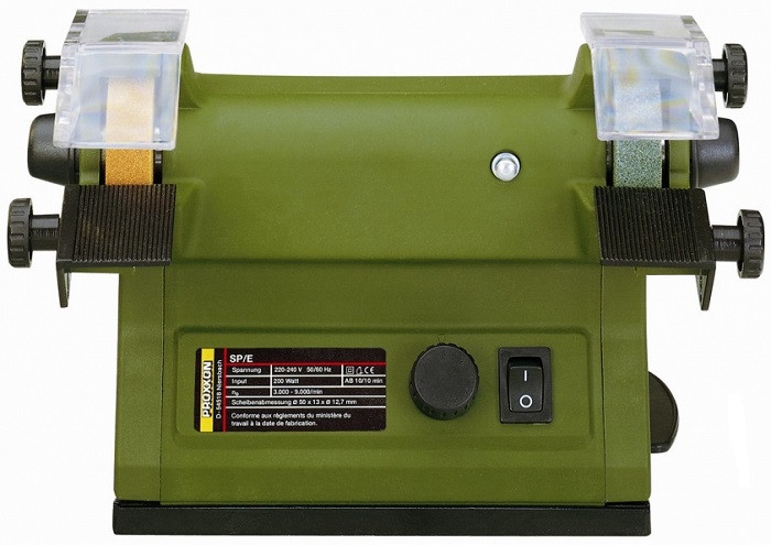 Proxxon SP/E (28030) - шлифовально-полировальный , с электронной системой регулировки оборотов. Для более комфортной работы рабочие столики и кожуха имеют регулировку. Комфорт в работе также придаст блокировка шпинделя, благодаря которой Вы сможете быстро и легко заменить шлифовальные круги или диски. В комплекте со станком идут для шлифовальных диска, корундовый и кремний-карбидный. Их кстати Вы всегда сможете отдельно приобрести у нас. Купить шлифовально-полировальный станок Proxxon SP/E Вы сможете просто позвонив нам или оставив заказ на нашем сайте. Технические характеристики Мощность (Вт) 100 Напряжение (В) 220-240 Скорость вращения шпинделя (об/мин.) 3000-9000 Гарантия (мес.) 12 Страна производитель Германия