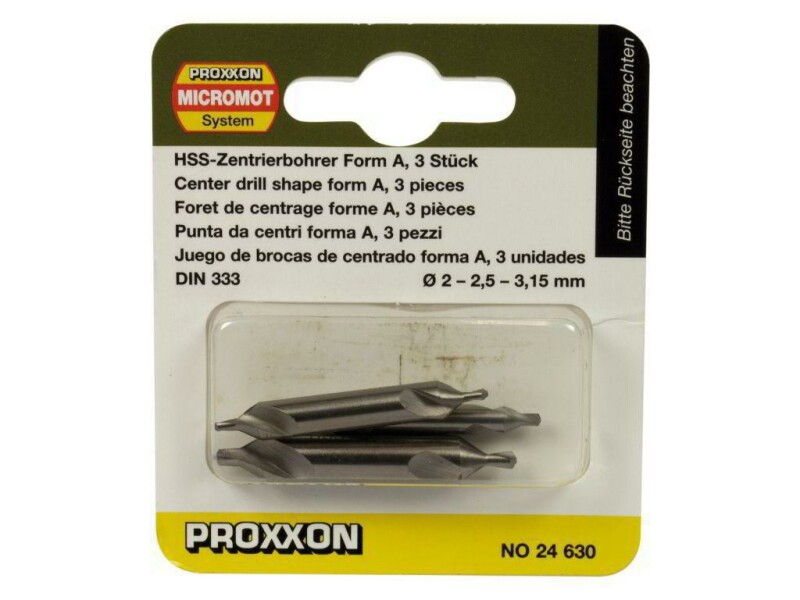 Сверла центровочные Proxxon применяются в токарных работах для токарных станков. С их помощью возможно обрабатывать детали и заготовки из алюминия, стали, пластика и латуни. В комплект входят три сверла из быстрорежущей стали HSS, имеющие диаметр 2, 2,5 и 3,15 мм.