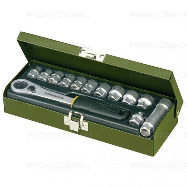 Специализированный, сквозных головок компании PROXXON, комплект из 13 шт. 5,5 – 14 мм стандарта 1/4". Набор инструментов, адресованный к очень требовательным профессиональным пользователям. Хороший подбор компонентов особенно подходит для автомехаников, а также в промышленности, где возникает необходимость работы на длинных резьбовых элементах. Набор включает в себя: - проходная трещотка 1/4”, - вороток для головок стандартных 1/4", - удлинитель для головок сквозных, - насадки проходные 1/4": 5,5 / 6 / 6,5 / 7 / 8 / 9 / 10 / 11 / 12 / 13 мм, Позволяет выполнять работу, требующую очень высоких нагрузок и точности, позволяет выполнять множество работ, связанных с переставлением и прокручиванием резьбовых соединений на длинных элементах. Набор упакован в металлический чемодан.
