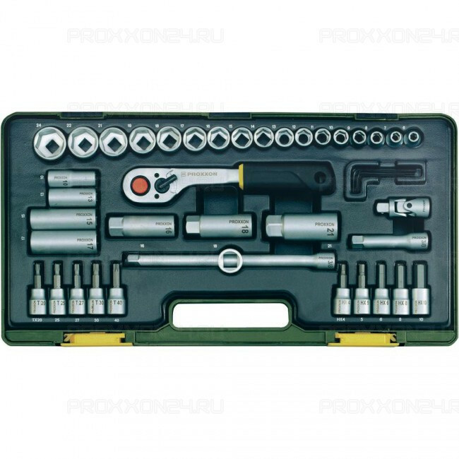 Компактный инструмента со средней флажковой трещоткой на 3/ 8’’ (код 23282) – практичный набор инструментов для широкого спектра монтажно-демонтажных работ. Описание: инструменты изготовлены из хром-ванадиевой стали. Набор хранится в пластиковом боксе с двумя надежными защелками. Внутри вкладыш стойкий к деформации, который обеспечивает отличную фиксацию всех элементов. В наборе из 47 предметов есть: – торцевые головки на 6 – 24 мм; – средняя флажковая трещотка на 3/ 8; – удлиненные головки для выступающих болтов 10 – 17 мм; – свечные ключи на 14, 16, 18 и 21 мм; – два удлинителя, один из них с ползунком; – 5 шестигранных ключей от 1,25 до 3 мм; – отверточные биты для шестигранных (4 – 10 мм) и звездообразных (ТХ20 – ТХ45) винтов.