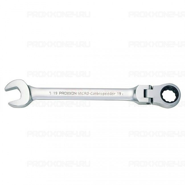 MicroSpeeder фирмы Proxxon - прочный и удобный в эксплуатации с обгонной муфтой и поворотной на ±90 ° головкой. Основные характеристики: - ключ изготовлен из хром-ванадиевой стали с дополнительной закалкой; - двойное никелирование и хромированное финишное покрытие; - долговечная лазерная гравировка размеров на корпусе; - кольцевая головка изогнута на 15 ° и оснащена реверсным рычагом для изменения направления вращения; - обгонная муфта из твердого сплава с 72 зубцами обеспечивает движение храповику, даже если ключ можно повернуть только на 5 °; - головка с самоблокирующимся шарнирным соединением и поворотом на 90 ° в обе стороны удобна для работы в труднодоступных местах; - соответствует стандартам DIN 3110 и ISO 3318