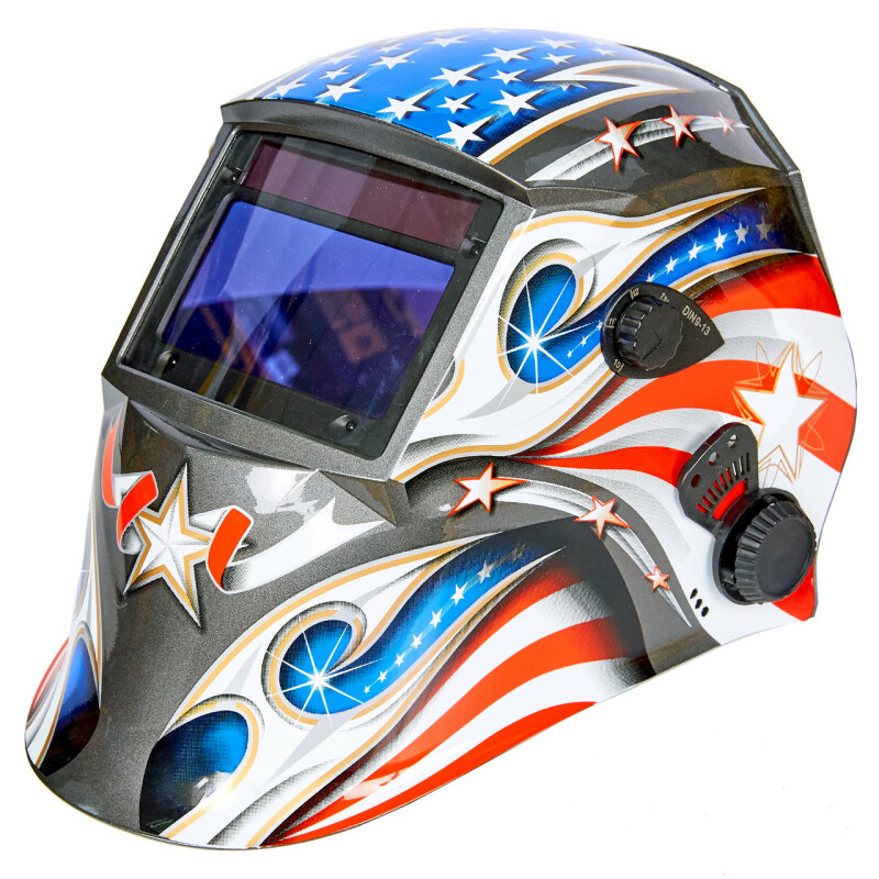Профессиональная авто Хамелеон SUN7 AMERICAN FLAG, выделяется на фоне конкурентов увеличенным размером рабочей площади светофильтра и особой конструкцией на головного крепления, которое позволяет добиться оптимального расположения щитка относительно лица оператора. Кроме того жидкокристаллический фильтр маски одинаково эффективен абсолютно для всех типов сварки: MMA, MIG-MAG, и TIG, TIG PULSE, а так же для сварки на малых токах. Материал Полиэтилен. Размер защитных пластин 123,5x99 мм. Экран оснащён 4 оптическими датчиками. Размер рабочей площади светофильтра 99х55 мм. Рабочие температуры -5 / 40 C. Время срабатывания 1/30000 секунд. Новый, большой, защитный экран маски оснащён регулировкой ступени затенённости DIN9 - DIN13, регулировкой чувствительности светофильтра, регулировкой времени перехода в светлое состояние, регулировкой перехода между режимами сварка/заточка. Солнечная батарея светофильтра, дублированная аккумуляторами, не требует замены элементов питания. Щиток сделан из высококачественного негорючего полиэтилена покрытого защитной плёнкой. Данное покрытие, а так же обтекаемая форма маски - предотвращает прилипание сварочных брызг. Регулировки наголовника позволяют изменить диаметр охвата наголовника - поворотом всего одной ручки, отрегулировать глубину посадки, переставляя пластиковые шипы в пазах, задать необходимый угол наклона щитка и усилие для опускания/поднимания маски, выставить комфортное расстояние от лица до светофильтра. Наличие мягкой налобной накладки, обилие регулировок и подстройка центра тяжести маски «хамелеон» – позволяет сварщику подогнать щиток под нужные параметры и сделать свою работу максимально комфортной. в комплекте Стекло увеличительное 2 диоптрии