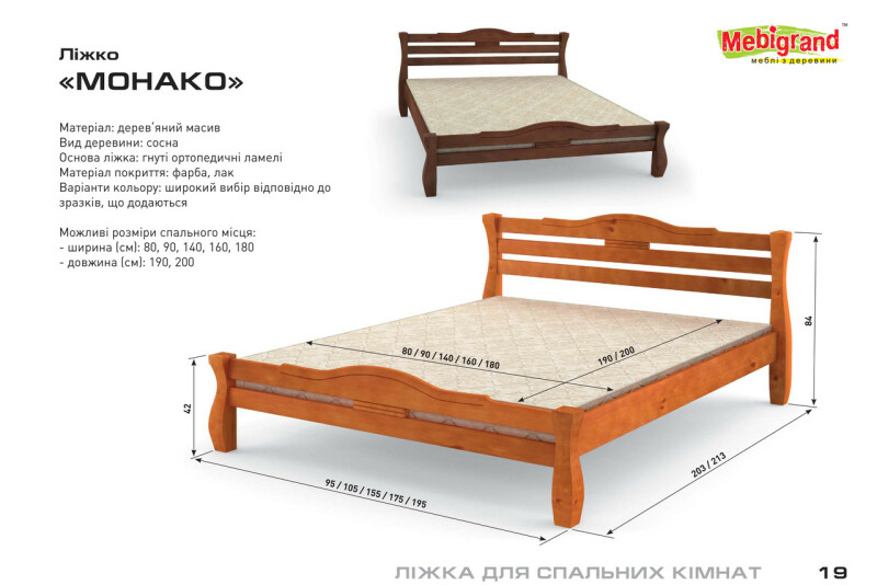 Внимание, во избежание недоразумений, перед заказом товара, просьба уточнять цену и наличие! Кровать Монако: Материал: Деревянный массив Вид дерева: Сосна Основание кровати: Гнутые ортопедические ламели Материал покрытия: Краска, лак Возможные размеры спального места: Ширина (см): 90, 140, 160, 180 Длина (см): 200 ВНИМАНИЕ: Матрас в стоимость не входит Цена указана за размер 160х200 в самой дешевой категории цвета (1 из 5) Все остальные вопросы уточняйте у менеджера