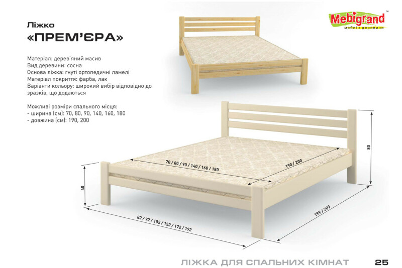 Внимание, во избежание недоразумений, перед заказом товара, просьба уточнять цену и наличие! Кровать Премьера: Материал: Деревянный массив Вид дерева: Сосна Основание кровати: Гнутые ортопедические ламели Материал покрытия: Краска, лак Возможные размеры спального места: Ширина (см): 90, 140, 160, 180 Длина (см): 200 ВНИМАНИЕ: Матрас в стоимость не входит Цена указана за размер 160х200 в самой дешевой категории цвета (1 из 5) Все остальные вопросы уточняйте у менеджера
