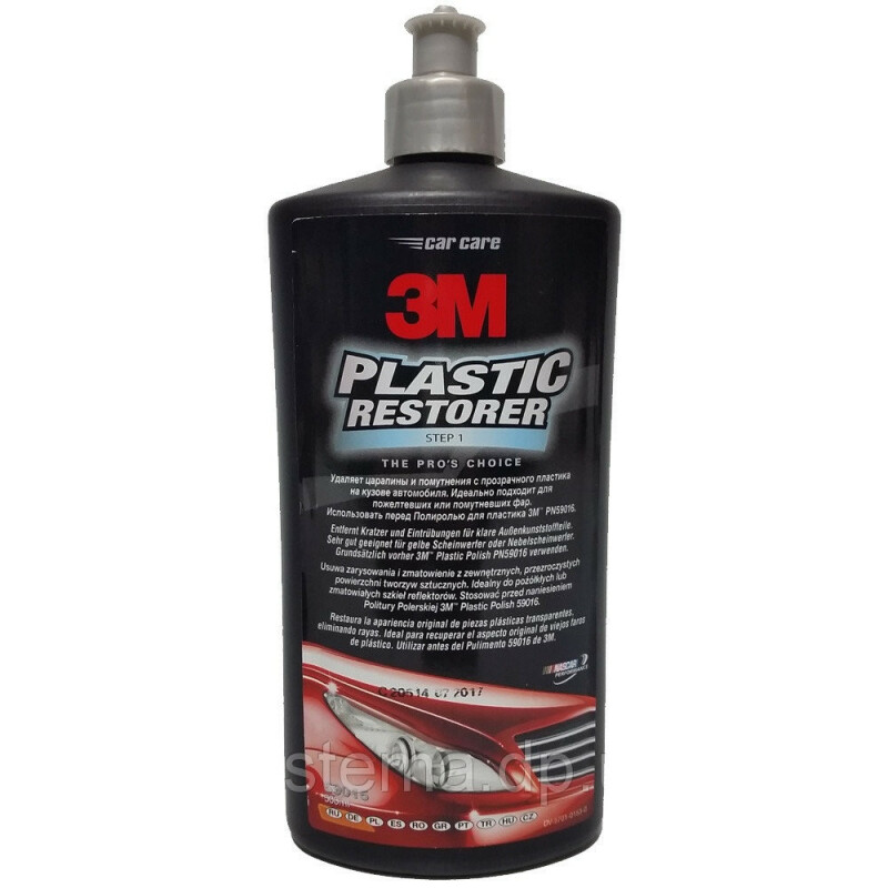 Восстановитель пластика 3M™ Удаляет царапины и помутнения с прозрачного пластика на кузове автомобиля Идеально подходит для пожелтевших или помутневших фар Использовать перед Полиролью пластика 3M™ Инструкция по применению: Нанесите на небольшой участок. Обработайте участок круговыми движениями до высыхания, вручную или с помощью машинки с средним давлением. Удалите остатки с помощью Микрофибровая салфетка 3M™ На финальном этапе используйте Полиролью пластика 3M™